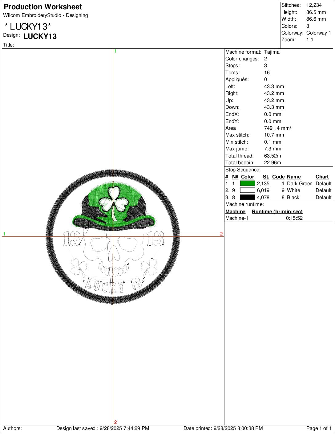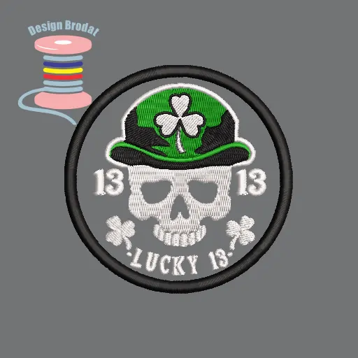 Model digitalizat de broderie „Lucky 13”, reprezentând un craniu stilizat cu pălărie verde și trifoi, simbol al norocului și al atitudinii rebele.