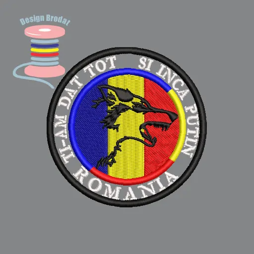 Model de broderie digitalizată ce înfățișează capul de lup pe fundal tricolor, cu mesajul „Ți-am dat tot și încă puțin – ROMANIA”. Emblema transmite curaj, patriotism și respect pentru tradițiile românești.